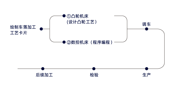 車落零件加工工序第一步需要繪制車落工藝卡片,然后通過(guò)車落工藝圖進(jìn)行凸輪加工工藝(凸輪機(jī)床)的設(shè)計(jì),并將設(shè)計(jì)好的凸輪加工工藝通過(guò)專用的凸輪加工設(shè)備加工制造出來(lái),后續(xù)調(diào)整工通過(guò)加工制造出來(lái)的凸輪來(lái)進(jìn)行設(shè)備的調(diào)整;數(shù)控機(jī)床則需通過(guò)機(jī)床G代碼M指令進(jìn)行編程,通過(guò)編程好的程序進(jìn)行調(diào)車實(shí)現(xiàn)復(fù)雜零件的生產(chǎn)制造。