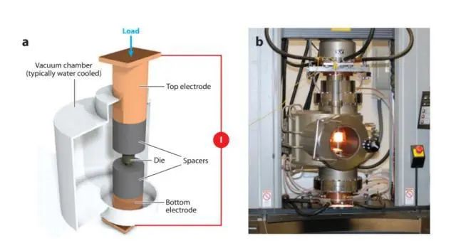 放電等離子燒結(jié)是利用脈沖電流作用于導電模具內(nèi)的試樣,在較短保溫時間內(nèi)(1~10min)燒結(jié)樣品的一種方法,且其升溫速率通常大于100℃/min。通過這種向粉末施加單軸載荷和脈沖直流電流的方式,可以使得難以燒結(jié)的SiC陶瓷在較低的溫度和較短的時間內(nèi)實現(xiàn)致密化,有效地抑制SiC的晶粒長大。因此,SPS可以實現(xiàn)材料的高致密度、精細顯微組織和干凈晶界,從而全面提升材料的力學性能,但是SPS只適用于制備形狀簡單的小尺寸樣品。