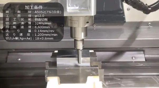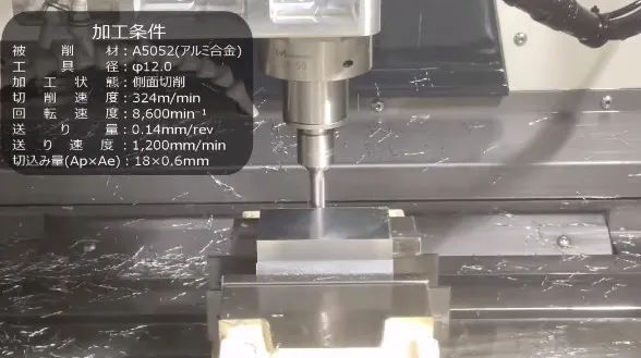 A5052鋁合金工件進(jìn)行側(cè)面切削加工,使用直徑12mm銑刀,加裝在新產(chǎn)品NAKANISHI高速電主軸BMS-5010進(jìn)行加工,下面松本機(jī)電就來(lái)簡(jiǎn)單展示加工時(shí)參數(shù)。