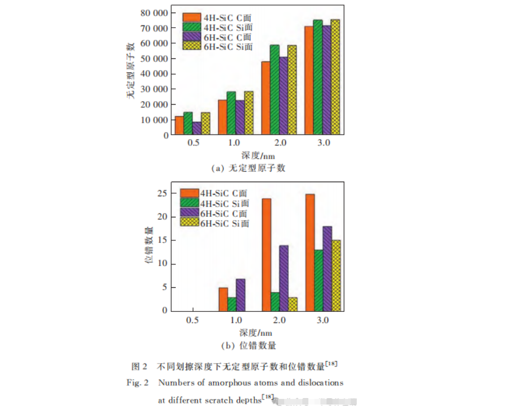 2020年,Z.G.Tian等人采用分子動力學(xué)模擬方法,對4H-SiC和6H-SiC的C面和Si面進行了劃痕實驗,研究表明,與Si面相比,C面的非晶態(tài)變形更少,材料的去除更有效,這種劃痕現(xiàn)象與SiC晶體基面上的位錯有關(guān)。圖2為不同試件在不同劃擦深度下無定型原子數(shù)和位錯數(shù)量。2021年,P.Zhou等人采用分子動力學(xué)方法研究了多磨粒隨機分布的固結(jié)磨料拋光SiC基片的表面形貌、亞表面損傷特征。結(jié)果表明,多磨粒在單一粗糙面中的暴露高度和磨粒分布決定了SiC襯底的去除行為;金剛石顆粒在固結(jié)磨料拋光墊中的隨機分布會使加工質(zhì)量變差。