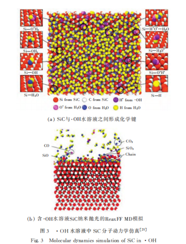 在CMP中除了存在與機械拋光相似的磨料劃擦作用外,化學(xué)作用的影響也至關(guān)重要。2021年,孫強采用分子動力學(xué)方法分別模擬了CMP中金剛石和SiO2磨粒對SiC表面原子去除機制。結(jié)果表明,SiO2在拋光過程中比金剛石更容易發(fā)生化學(xué)反應(yīng),原因是其通過與SiC表面原子持續(xù)成鍵和斷鍵來實現(xiàn)原子去除。2023年,Z.W.Yuan等人研究了SiC在羥基自由基(·OH)水溶液中的原子行為。結(jié)果表明,在只發(fā)生化學(xué)氧化的情況下,SiC表面吸附O、H、·OH生成Si—OH2、Si—OH、Si—H2O和Si—H等,Si原子未曾從SiC表面脫離,如圖3(a)所示。而在機械作用下,部分Si和C原子以SiO、SiO2、CO、CO2或鏈狀結(jié)構(gòu)脫離基體,其余Si和C原子則以吸附方式脫離基體,如圖3(b)所示。這些研究有助于從原子層面上解釋CMP中原子氧化去除的動力學(xué)過程,為揭示材料去除機理提供了一種有價值的方法。