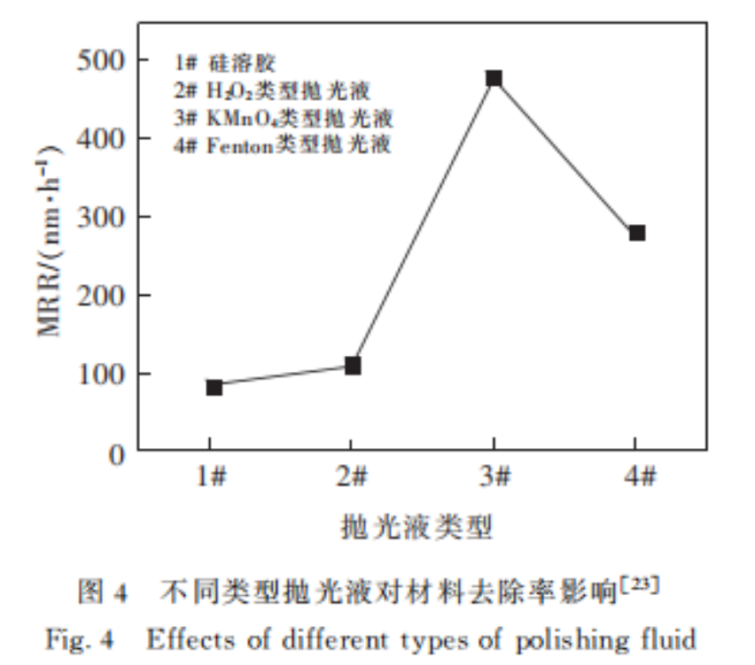 在目前的報道中,對于拋光液的研究思路包括改變氧化劑的種類和濃度、溶液pH值、分散劑、磨料等方法。通過調(diào)節(jié)拋光液中不同成分的含量,控制機械磨損與化學(xué)反應(yīng)之間的平衡,對獲得高MRR和無原子平面缺陷的表面起著關(guān)鍵作用。