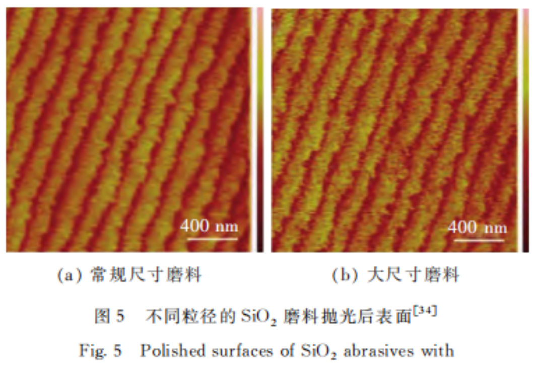 此外,也研究了不同粒徑的同種磨料對機械作用的影響。2014年,X.L.Shi等人詳細分析了不同磨料粒徑的硅溶膠對4H-SiC晶圓拋光性能的影響。通過理論推導(dǎo)和實驗分析得出,當(dāng)磨料粒徑較大時會導(dǎo)致不規(guī)則的平臺邊緣。反之,如果磨料粒徑較小,材料的去除將更規(guī)則,并且平臺邊緣將更平坦和光滑,指出磨料粒徑是決定CMP效率和晶圓表面最終平坦化質(zhì)量的重要因素。圖5所示為不同粒徑SiO2磨料拋光后的表面,其中常規(guī)尺寸磨料平均粒徑30.8nm,大尺寸磨料平均粒徑79.3nm。