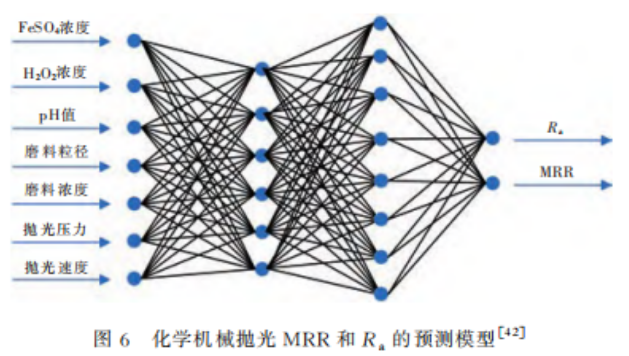 工藝參數(shù)與MRR、Ra之間的關(guān)系也可以通過建立模型來進行預(yù)測,為SiC的CMP加工提供參考。2021年,J.Y.Deng等人基于改進的Preston方程,研究了工藝參數(shù)對SiC拋光MRR和Ra的影響,并利用反向傳播神經(jīng)網(wǎng)絡(luò)建立了MRR和Ra的預(yù)測模型,如圖6所示。結(jié)果表明,隨著FeSO4質(zhì)量分數(shù)、H2O2質(zhì)量分數(shù)和pH值的升高,MRR呈先升高后降低的趨勢,拋光后Ra呈先降低后升高的趨勢。隨著磨料粒徑、磨料濃度、拋光壓力和拋光速度的增加,MRR不斷增大。Ra隨磨料粒徑和磨料濃度的增加而不斷減小,隨著拋光壓力的增加而增大,隨著拋光速度的增加而先減小后增大。不難看出,在SiC單晶的CMP中通過工藝優(yōu)化,對拋光效果起到了一定的改善和提高作用。