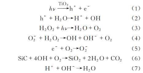 光催化化學(xué)機械拋光(PCMP)示意圖如圖7所示。將單晶SiC工件粘貼在拋光頭底端,使用含有光催化劑的拋光液,通過紫外光的照射,光催化劑顆粒表面產(chǎn)生空穴和電子,吸附在光催化劑顆粒表面的H2O和OH-可通過光生電子和空穴氧化成羥基自由基,然后將單晶SiC表面氧化成SiO2,化學(xué)反應(yīng)式為