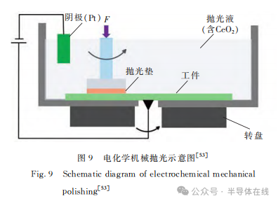 電化學(xué)機械拋光(ECMP)示意圖如圖9所示。ECMP是一種利用電解液作為拋光液,將工件的電化學(xué)腐蝕與機械拋光相結(jié)合的精密工藝。在單晶SiC(作為陽極)表面帶電后通過陽極氧化產(chǎn)生氧化層,然后用軟磨料機械去除氧化層,最后獲得超光滑無損傷的表面。