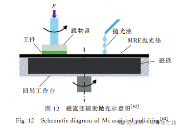 磁流變輔助拋光引入磁流變彈性體(MRE),與化學(xué)機械拋光相結(jié)合,在外加磁場、磁性拋光墊、氧化還原反應(yīng)的共同作用下,提高工件的材料去除率,降低表面粗糙度,實現(xiàn)對工件的超精密加工。磁流變輔助拋光示意圖如圖12所示。