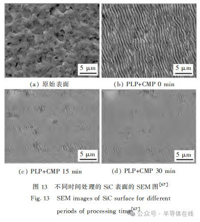 2021年,B.Gao等人提出了一種皮秒激光輔助CMP方法,首先用皮秒激光對SiC的Si面進行預(yù)處理,然后進行拋光。結(jié)果表明:皮秒激光預(yù)處理(PLP)產(chǎn)生的波紋和多晶層改善了表面加工性能,同時PLP氧化的C—O、Si—C—O和Si—O鍵易于材料去除。與非激光預(yù)處理樣品相比,激光預(yù)處理后樣品的材料去除率在拋光時前45 min顯著提高,而表面粗糙度顯著降低,如圖13所示。2021年,G.P.Chen等人采用納秒激光調(diào)制技術(shù)對SiCSi面進行預(yù)處理。結(jié)果表明,該技術(shù)可使表面氧含量增加,且氧化物成分一致,用Al2O3拋光液拋光后,Ra低至0.081nm。