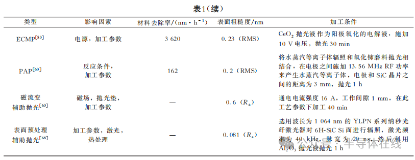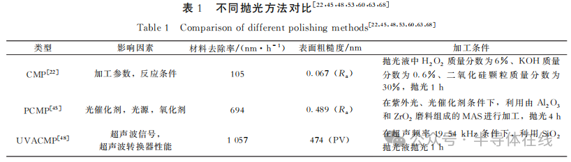 高效率地獲得光滑表面是半導(dǎo)體產(chǎn)業(yè)的一個關(guān)鍵問題,因此材料去除率和表面粗糙度被認為是評價單晶SiC拋光工藝兩個最重要指標(biāo)。不同拋光方法之間的對比如表1所示。