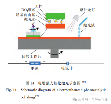 因此多個技術(shù)方向復(fù)合增效以達到化學(xué)氧化作用和機械去除作用同時提升的方法,引起了研究者的注意。比如,2019年,Y.He等人開發(fā)了一種用于4H-SiC晶圓Si面的電增強光催化拋光方法,如圖14所示。電流可以有效地防止半導(dǎo)體顆粒表面產(chǎn)生的電子與空穴的復(fù)合,從而提高拋光效率。以P25為光催化劑、H2O2為電子捕獲劑的拋光液拋光性能最好,MRR約為1180nm/h,在1.0μm×1.0μm范圍內(nèi),Ra約為0.053 nm。2019年,翟文杰等人對SiC進行了超聲-電化學(xué)機械研拋實驗。實驗結(jié)果表明,在試件與拋光盤之間的電壓為+10V時,材料去除率比無電壓時提高了55.1%;當(dāng)對試件施加超聲-電場作用后,材料去除率比無超聲時提高了91.7%。