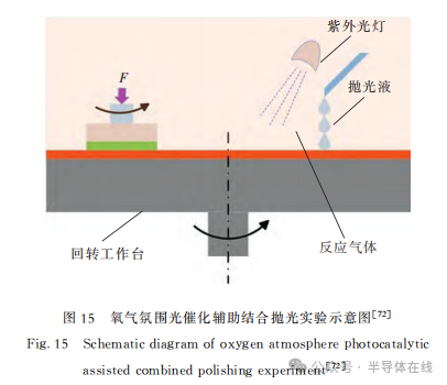 2021年,T.Yin等人采用高濃度氧氣氛圍與光催化輔助拋光相結(jié)合,對SiC襯底CMP特性進行了研究。結(jié)果表明:與常規(guī)空氣氣氛相比,將空氣氣氛中的氧(O2)分壓增加到300kPa,Si面和C面的材料去除率均增加超過2倍。實驗示意圖如圖15[72]所示。2022年,鄧家云使用Fe3O4作為催化劑,對電Fenton化學(xué)機械拋光進行了研究,利用電場參數(shù)控制CMP中·OH的生成速率和總濃度,實現(xiàn)·OH的持續(xù)、穩(wěn)定、可控生成,加速SiC的氧化腐蝕作用,從而達到與磨粒去除的協(xié)同效應(yīng),最終MRR為2358nm/h、Ra為0.372nm。