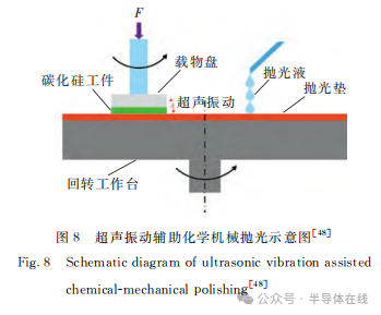超聲振動輔助化學(xué)機械拋光(UVACMP)是一種經(jīng)濟有效地提高SiC單晶拋光性能的技術(shù)。通過超聲波發(fā)生器將電信號轉(zhuǎn)換成超聲振動,超聲振動作用在拋光區(qū),使拋光液中磨料更加分散,并且使磨料獲得一定動能,加大了拋光中的機械作用,同時振動過程中產(chǎn)生的熱促進了拋光中的化學(xué)作用,超聲振動輔助化學(xué)機械拋光示意圖如圖8所示。