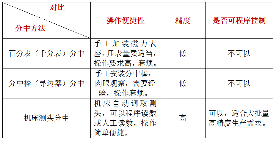 使用百分表(千分表)分中全部需要人工操作,對人員要求很高,操作時(shí)間長,且存在人為誤差,該方法已經(jīng)逐步被淘汰,主要是一些個(gè)體戶或者精度要求不高的加工廠使用。