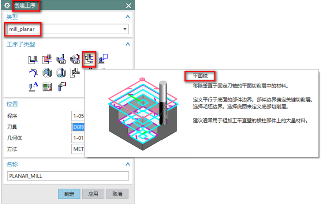 在加工界面中,【創(chuàng)建工序】-【mill_planar】-【平面銑】,如下圖所示: